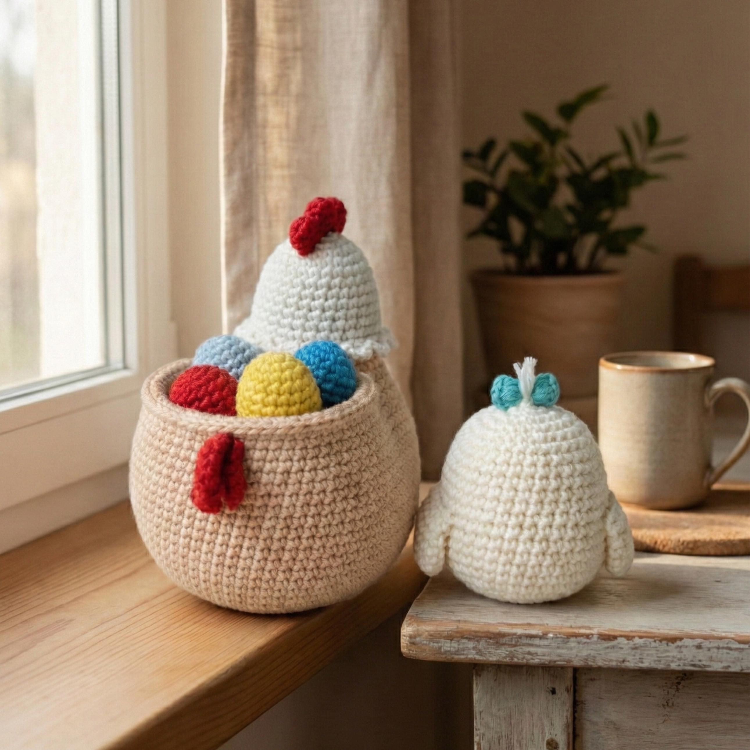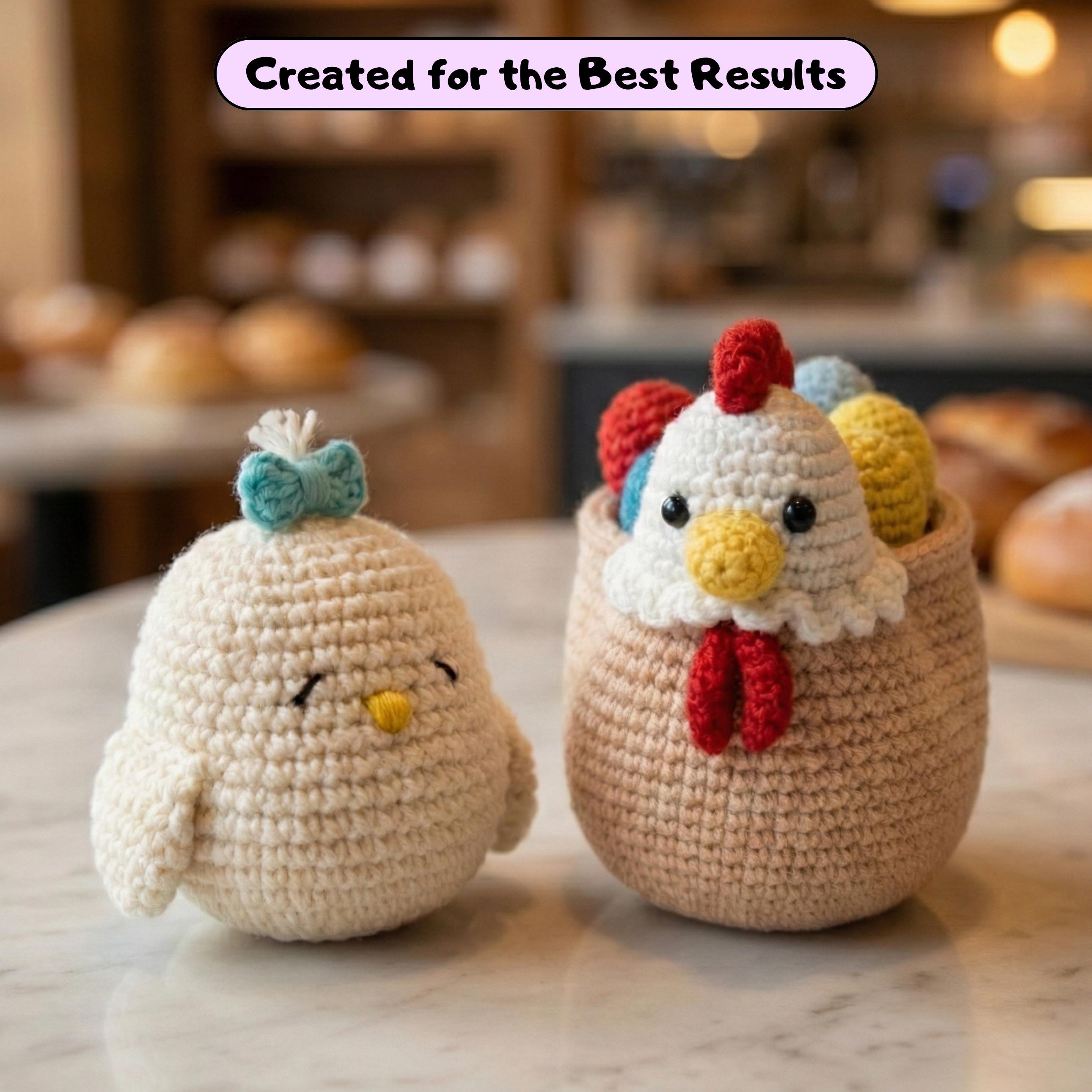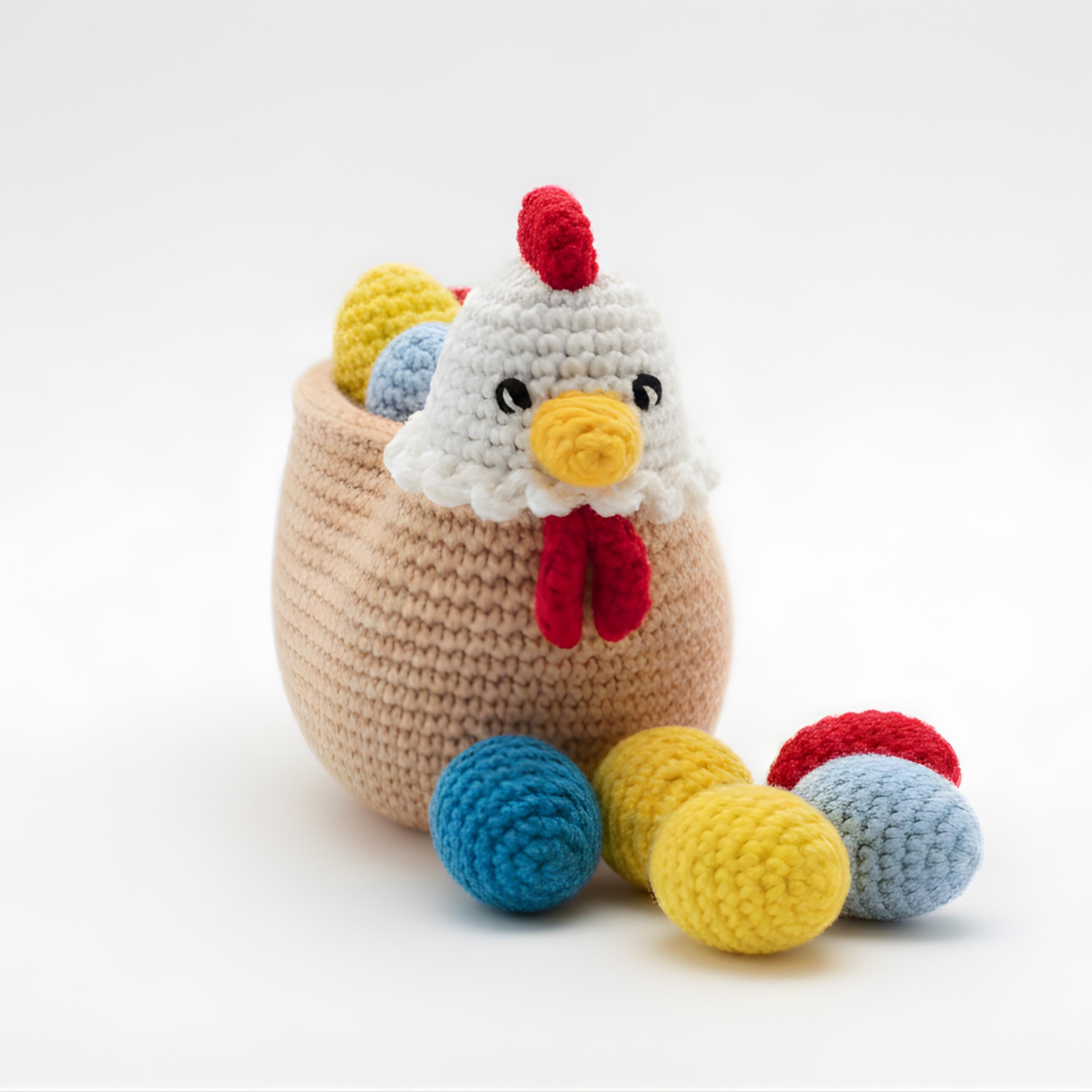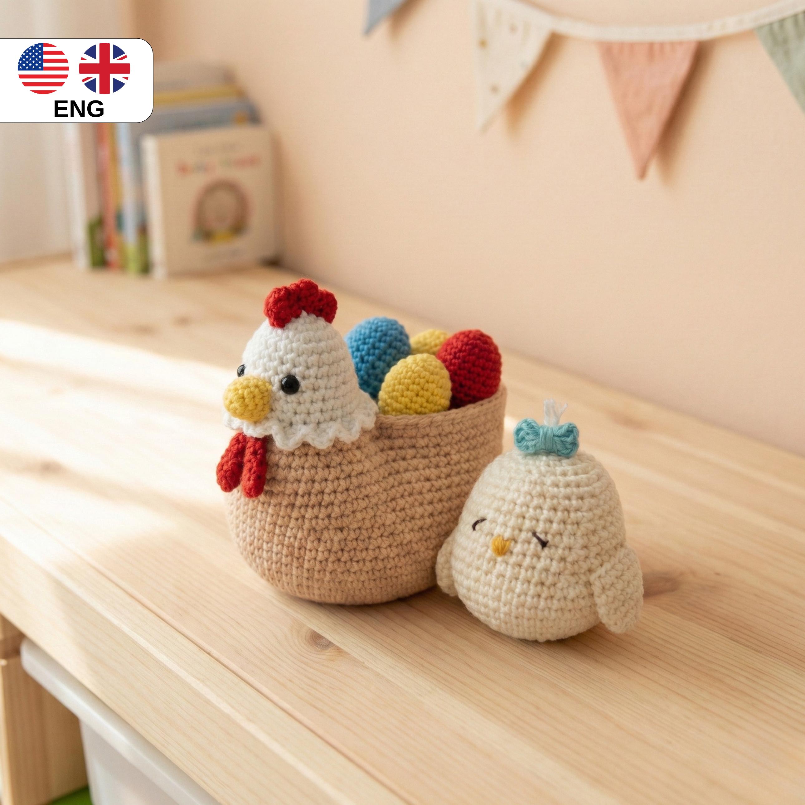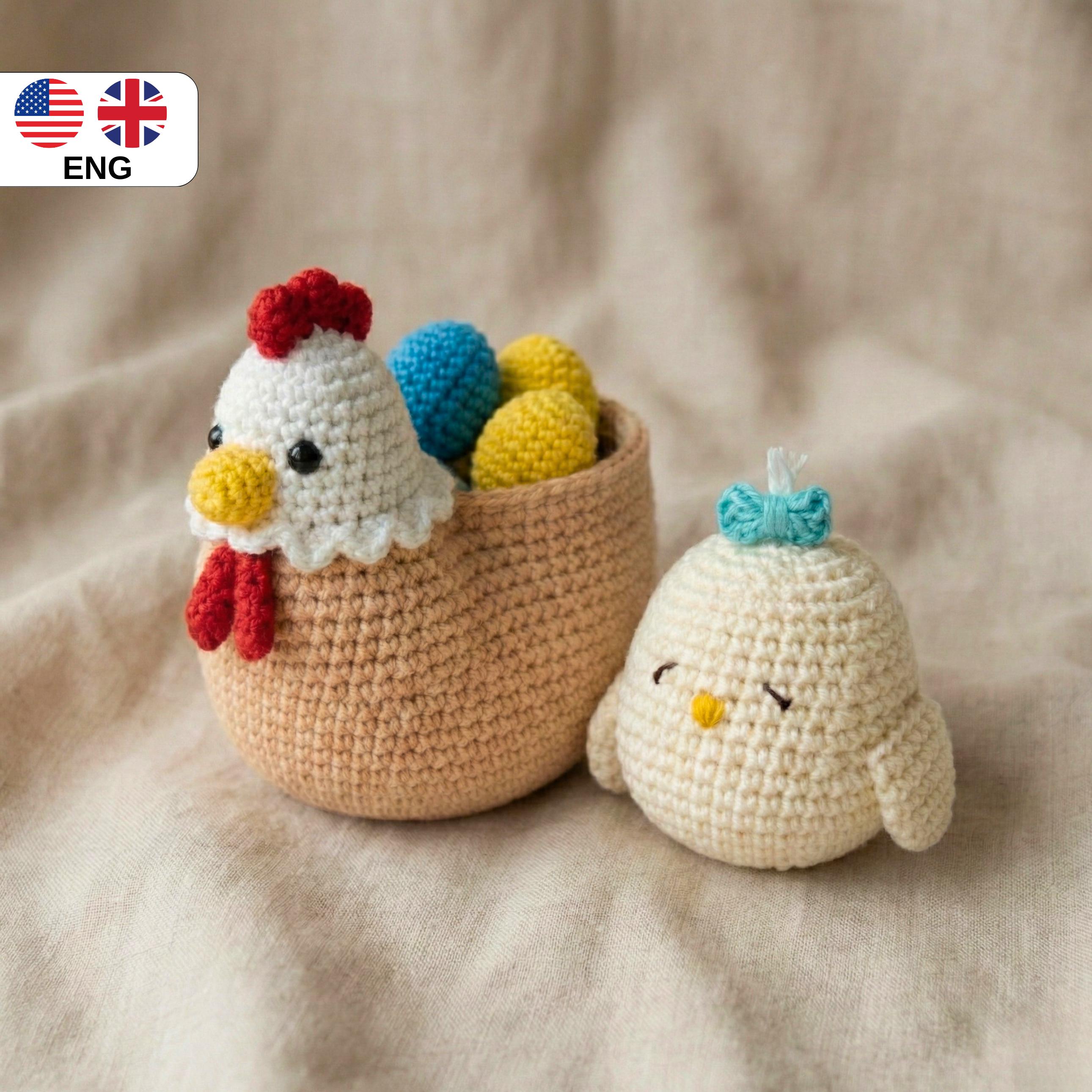 This listing is for a detailed digital crochet pattern (PDF) that guides you step by step in creating an Easter Chicken basket with small crochet eggs and a Cute Chick amigurumi version.