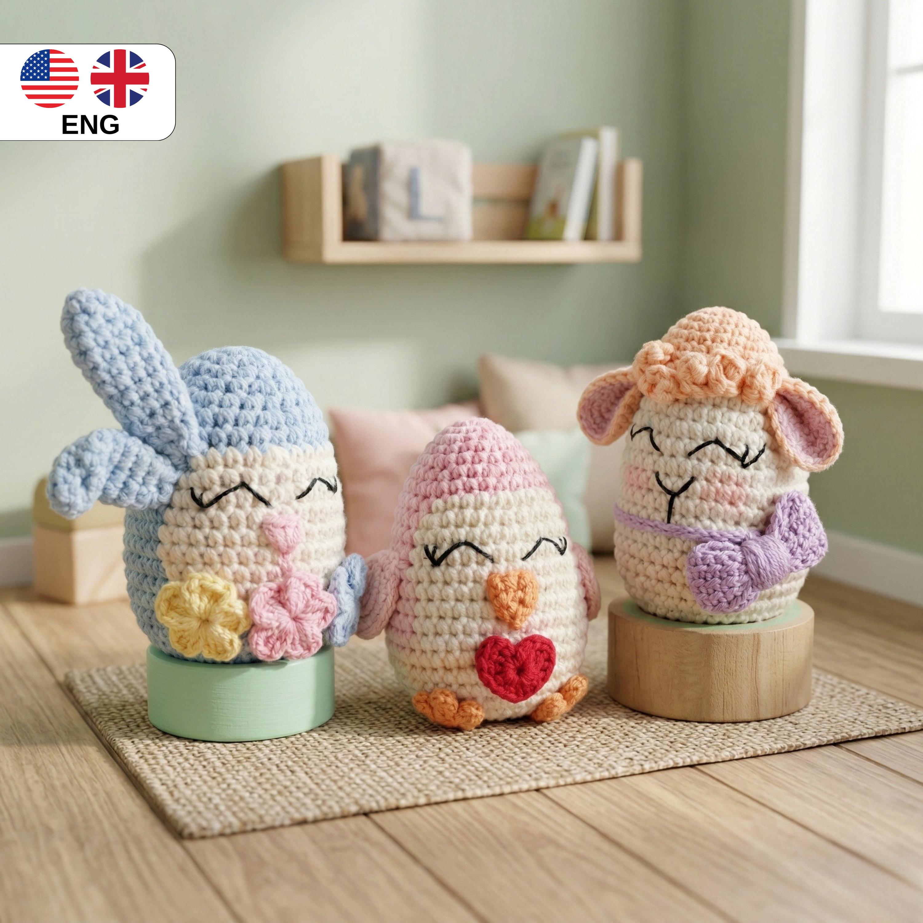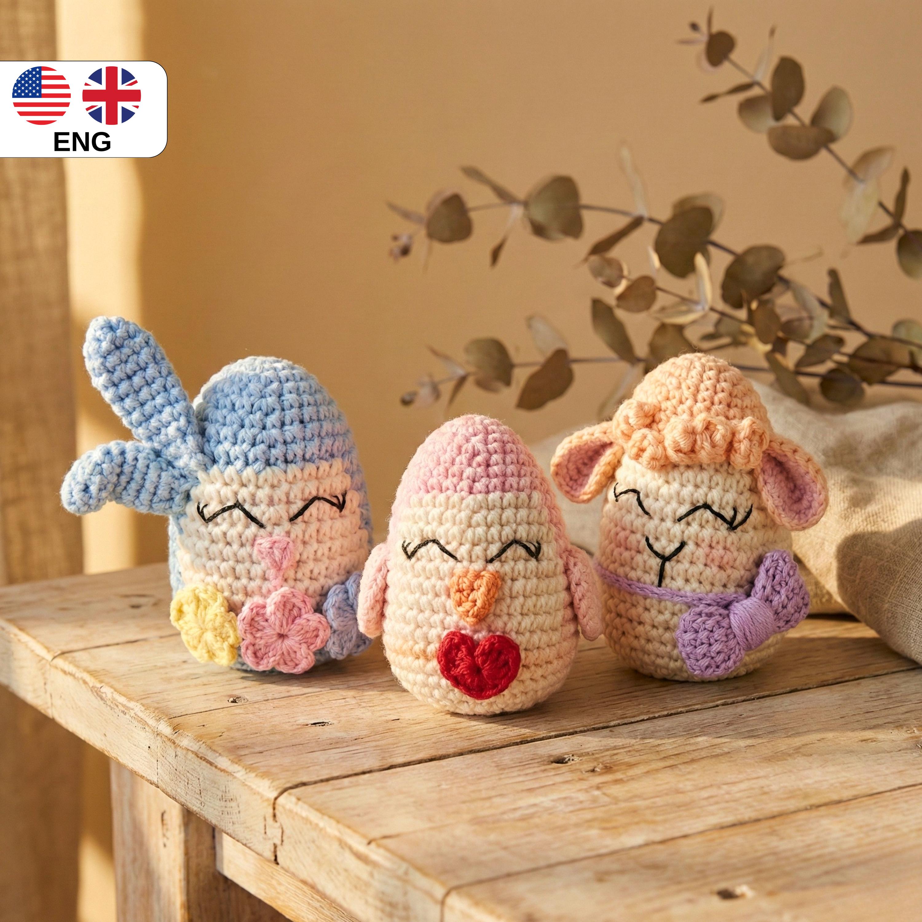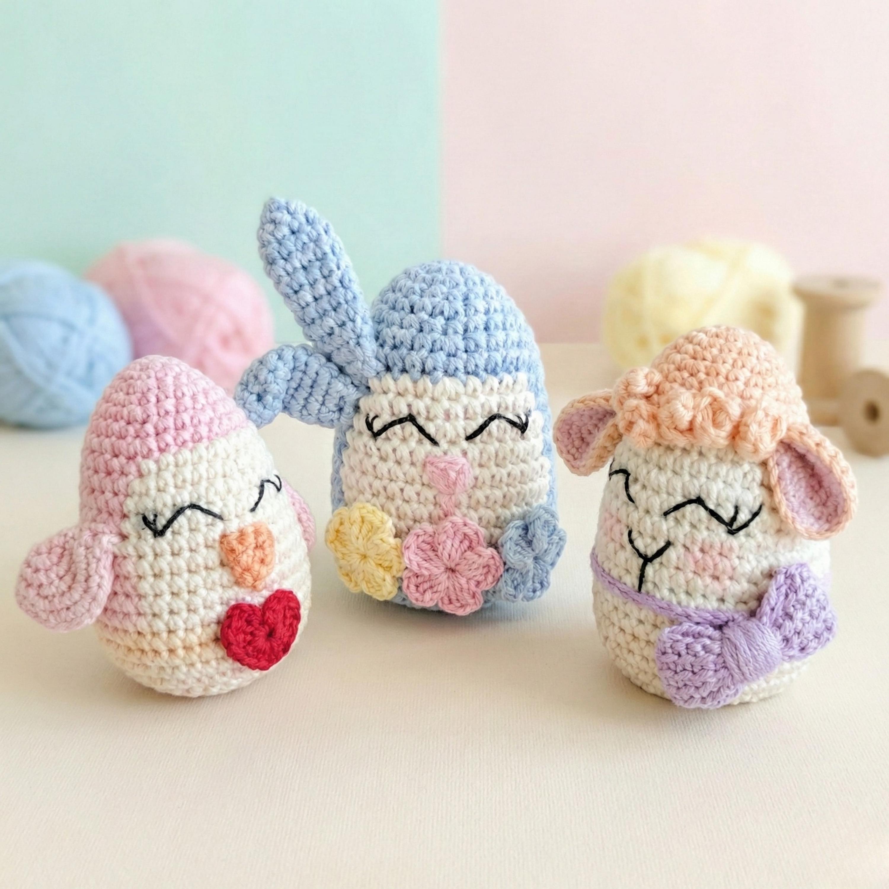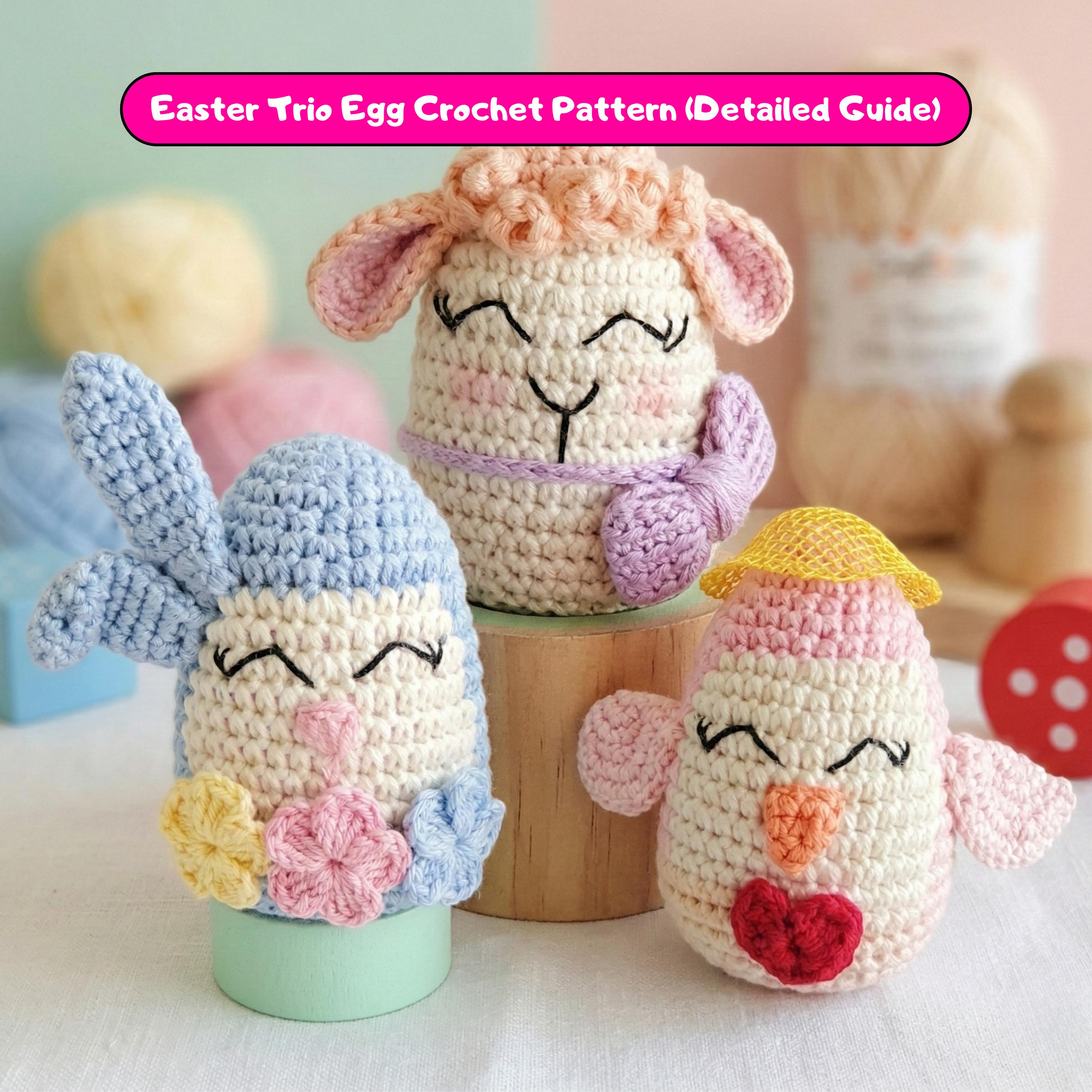 This listing is for a detailed Easter Trio Egg Amigurumi crochet pattern (PDF) designed to help you create three adorable spring-themed egg characters: a Bunny, a Lamb, and a Chick.
