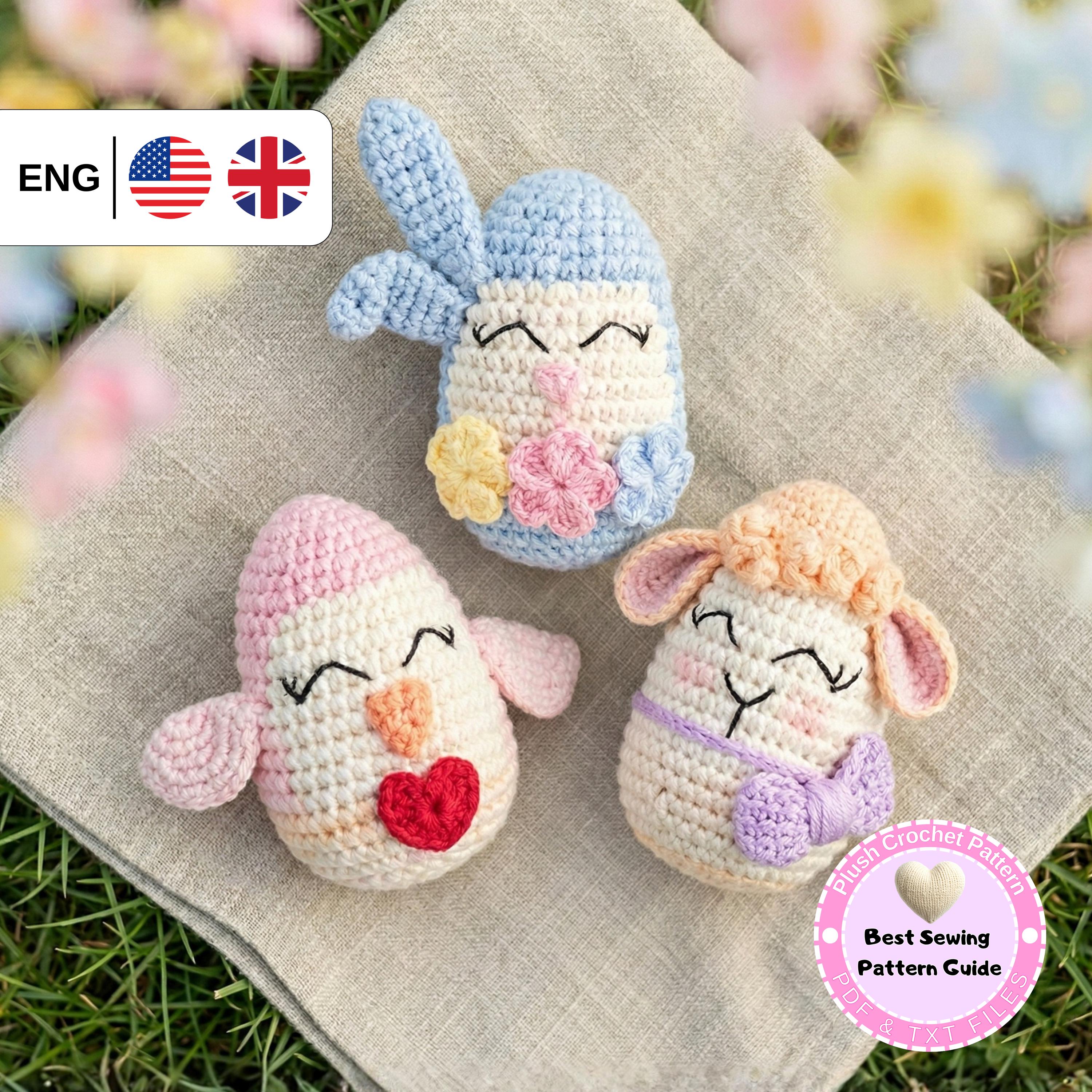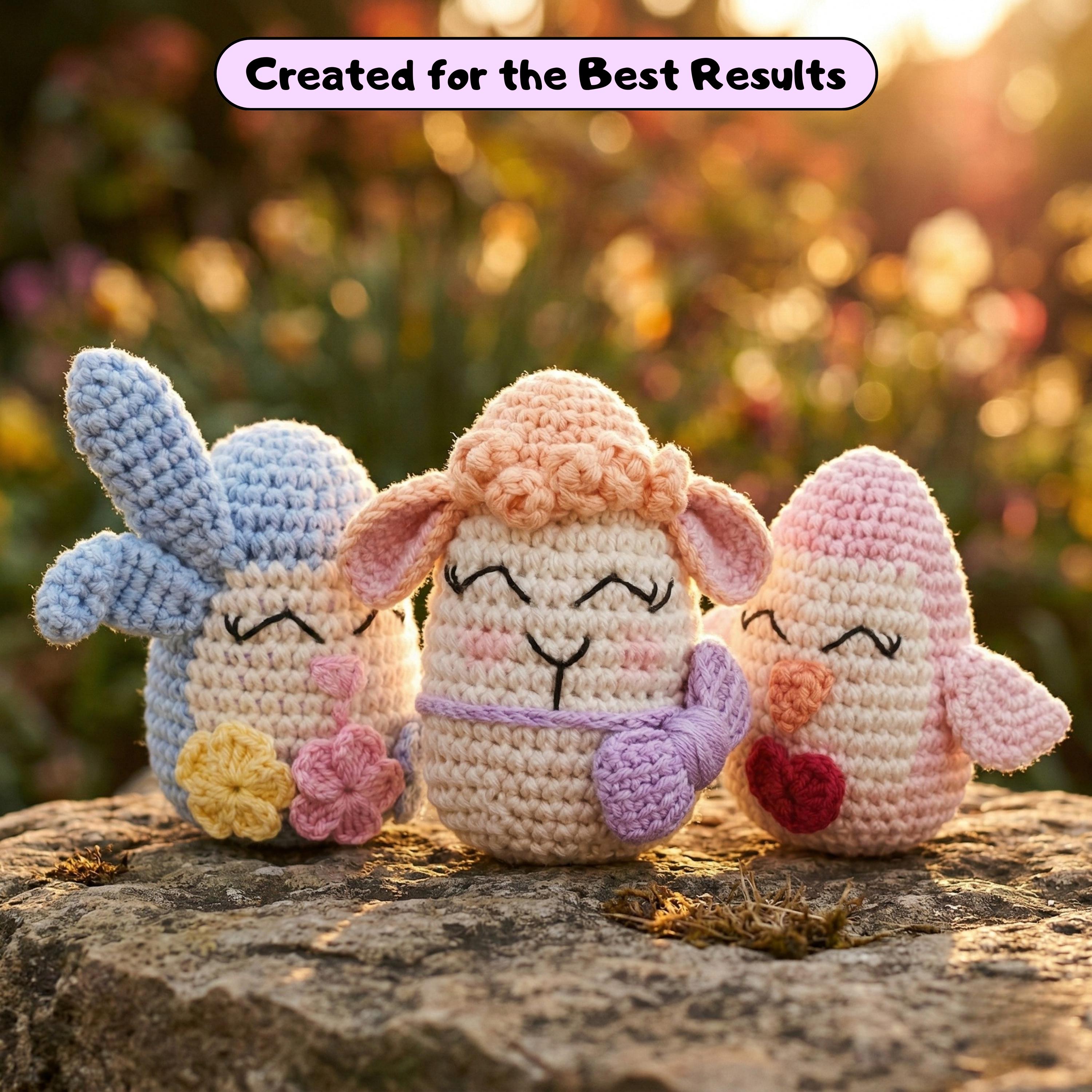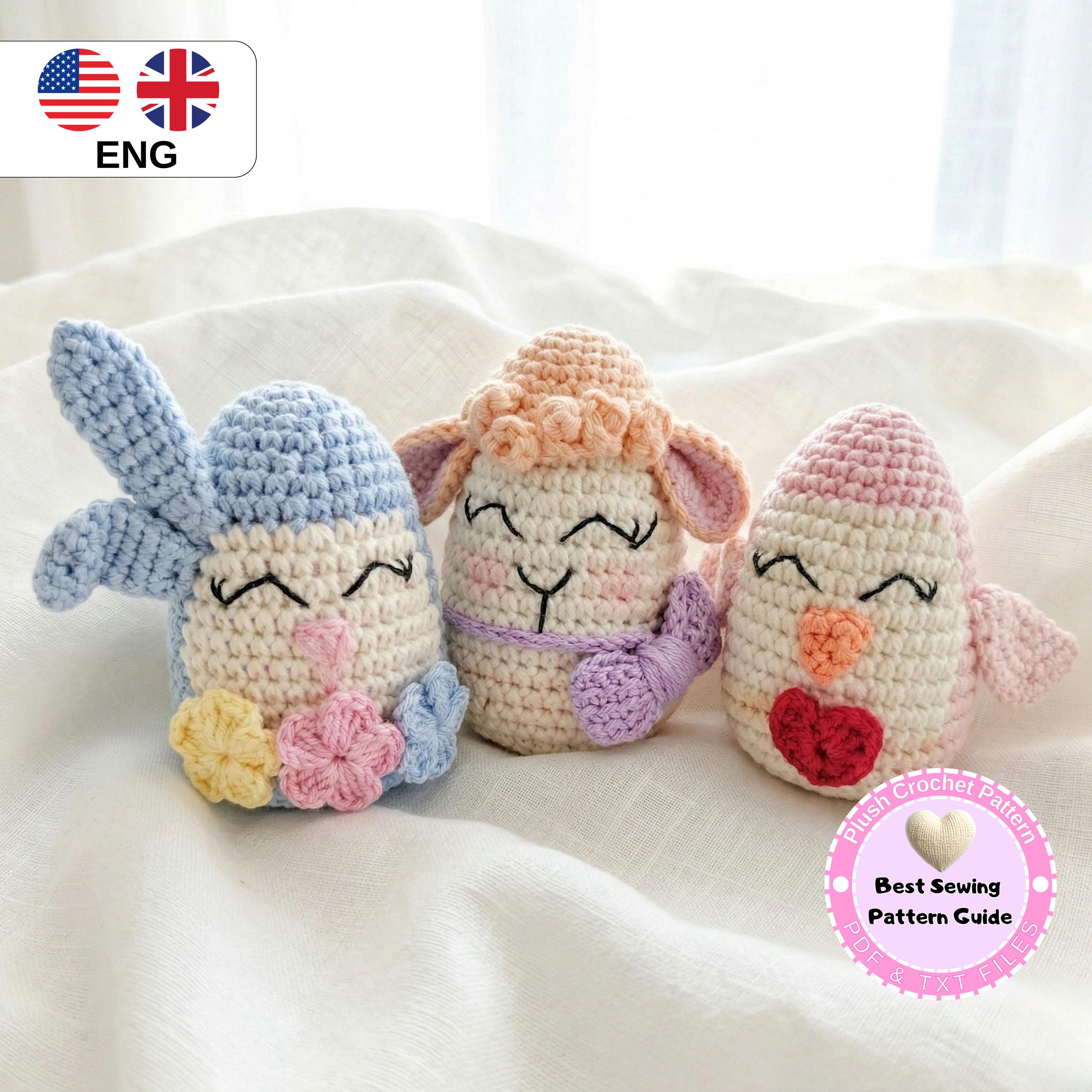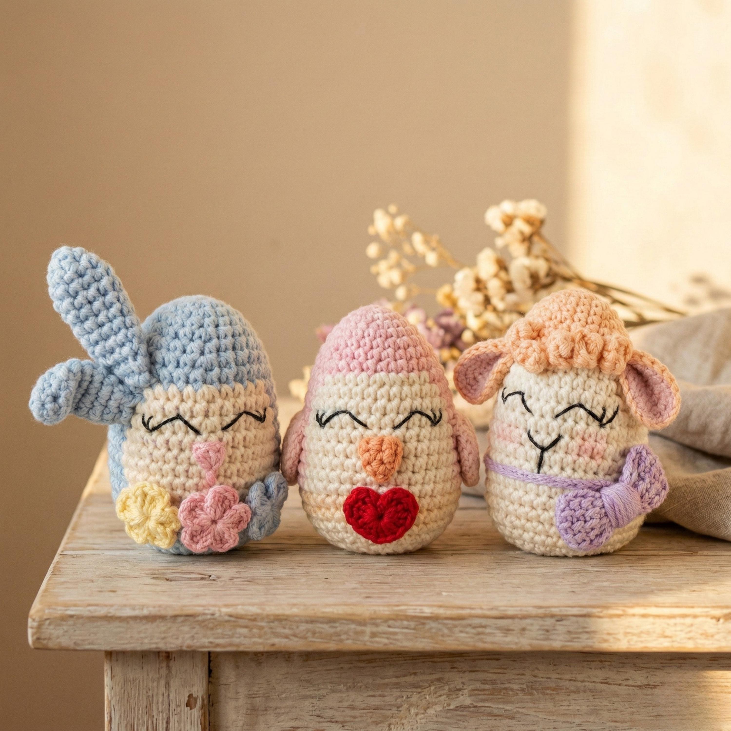 This listing is for a detailed Easter Trio Egg Amigurumi crochet pattern (PDF) designed to help you create three adorable spring-themed egg characters: a Bunny, a Lamb, and a Chick.